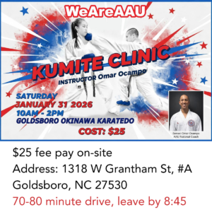 Jan. 31 – We Are AAU Kumite Clinic with AAU Karate National Coach Omar Occampo at the Goldsboro Okinawan Dojo, Here is a note from Sensei Jason Adams: “Good evening, The clinic will be at the Goldsboro Okinawa Karatedo dojo at 1318 W. Grantham Street, Suite A, Goldsboro NC 27530. The clinic is from 10:00 am to 2:00 pm and the cost is $25.